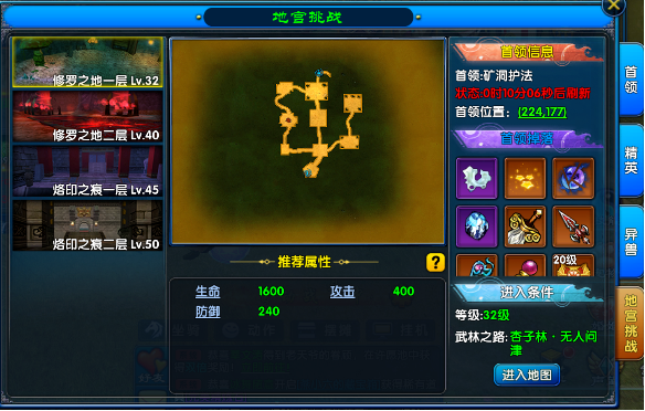 地宫共分为四层,每层的怪物配置、BOSS 强度及奖励体系均有差异,开启条件也逐层提升。一层 “修罗之地” 需玩家等级达到 32 级,且完成 “武林之路・杏子林” 剧情任务;二层开启需等级 40 级并通关对应武林之路章节;三、四层则分别要求 45 级和 50 级,同时满足相应剧情进度。建议玩家按等级梯度逐步挑战,避免因战力不足导致团灭。