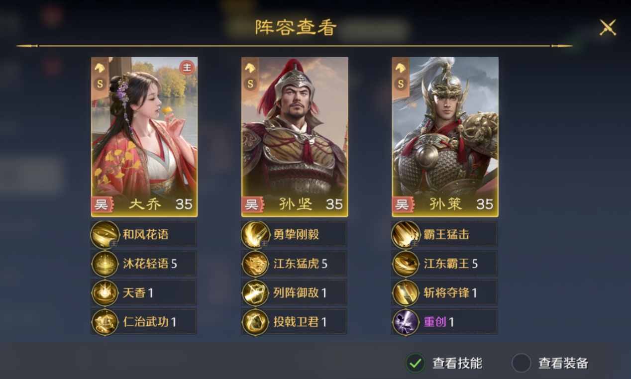 在平民能组出来的三橙开荒阵容中,性价比最高的是大乔+孙策+孙坚这阵容。这三个武将获取难度低,大乔6元首冲就可以获得,孙策来自七日登录任务,孙坚由系统邮件免费赠送,玩家几乎不需要抽卡就能组成核心队伍。三位角色可以形成江东霸主羁绊,大幅度提高队伍战斗力。初期孙坚担任主将最合适,他的怒气对处于威压状态的模板可以打出很高的倍率伤害,因此战法配置上应该优先堆叠高伤害和重伤效果。
