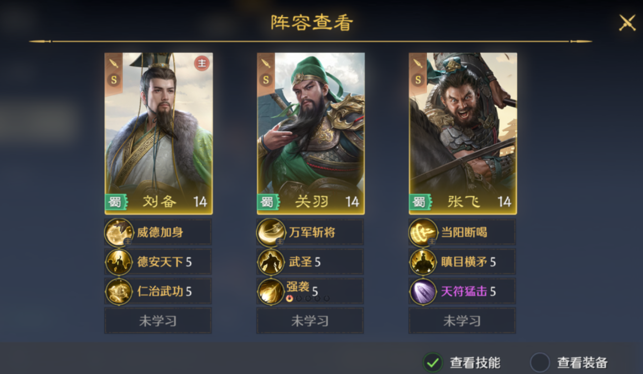 对于愿意花一些资源或者战法储备较高的玩家,刘关张桃园三结义也属于强势的开荒阵容。这套组合容易获得,兵种适配度也较高。刘备为主将的时候,治疗、增伤、减伤等综合属性最强,在开荒阶段最适合;加上关羽的刮骨疗伤、天香战法等,队伍耐久大幅度提高。关羽在队伍中主导权被削弱,可以用重伤、束手、虚弱等方式打乱敌人的节奏。