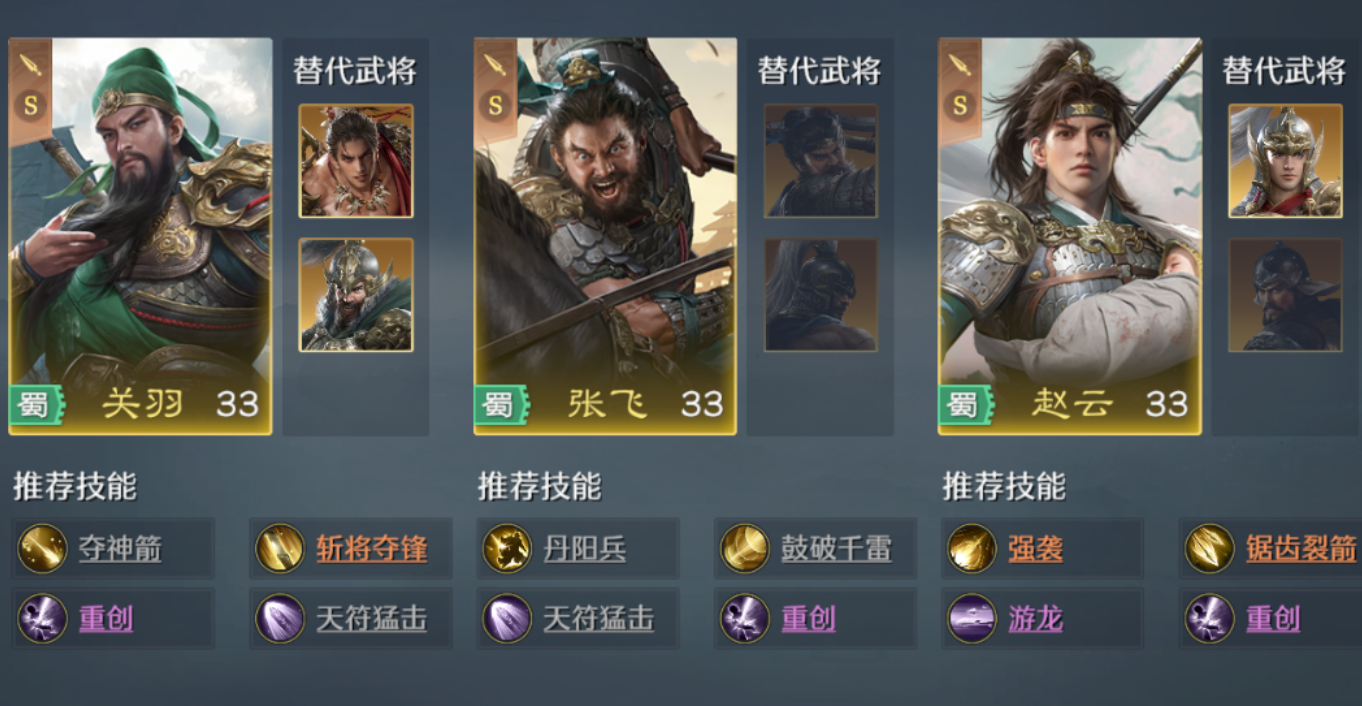 如果开荒阶段的玩家无法再凑齐上述队伍,那么下面这个性价比很高的过渡阵容也可以考虑,五虎重伤枪的赵云+关羽+张飞。这套阵容虽然没有刘备全面增益的效果,但是整体结果还是比较稳定,容易获得。关羽走重伤控制路线,张飞根据战法情况来决定是输出还是控制,赵云依靠高爆发和持续输出成为队伍的输出火力点。强袭、锯齿裂箭等战法都可以和该阵容配合出极好的效果。