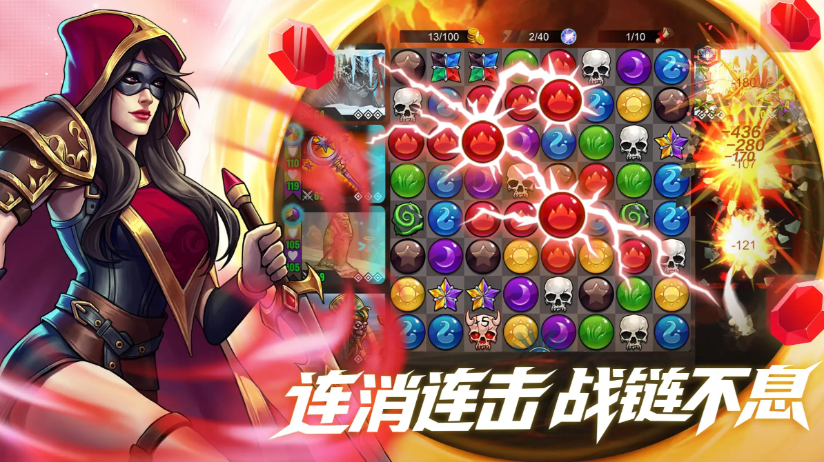 三消产出法力:同色相连≥3消获得对应颜色法力;≥4消获得额外行动回合;≥5消该法力值翻倍。棋盘上的骷髅可直接造成伤害,伤害按队伍首位角色攻击力结算;带数字的骷髅会额外增伤与回能