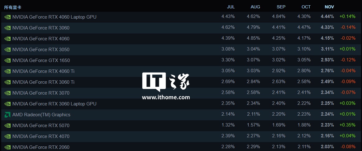 12 月 2 日消息,V社昨日发布了 2025 年 11 月的 Steam 硬件与软件调查报告。其中,英伟达 RTX 50 系列显卡强势崛起,RTX 5070 成功超越了前代 RTX 4070,首次进入 Steam 独立显卡份额排行榜前十名。