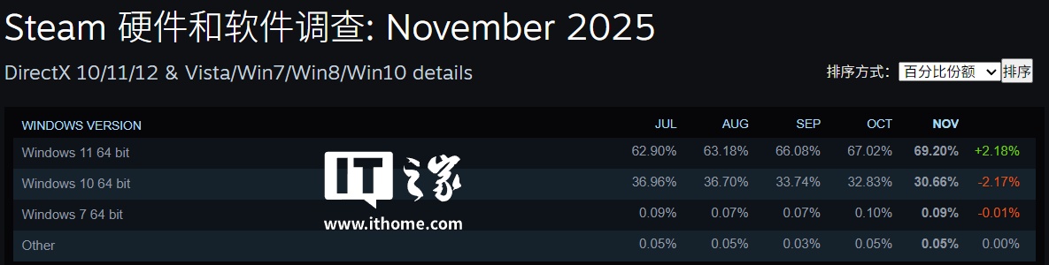 注意到,在 Windows 系统方面,11 月 Steam 平台的 Windows 11 占比继续攀升 2.18%,份额提升到了 69.2%;Windows 10 则下滑了 2.17%,份额为 30.66%。