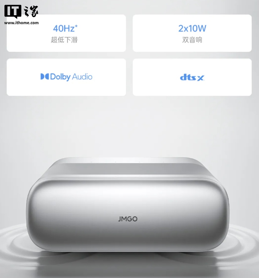 坚果 O3 搭载目氪护眼纯三色激光 + DLPC8424 驱动芯片,支持 1 万:1 对比度、110% BT.2020 色域,色准 ΔE < 1;配有杜比 HiFi 低音,两侧对称式 10W 双音响。