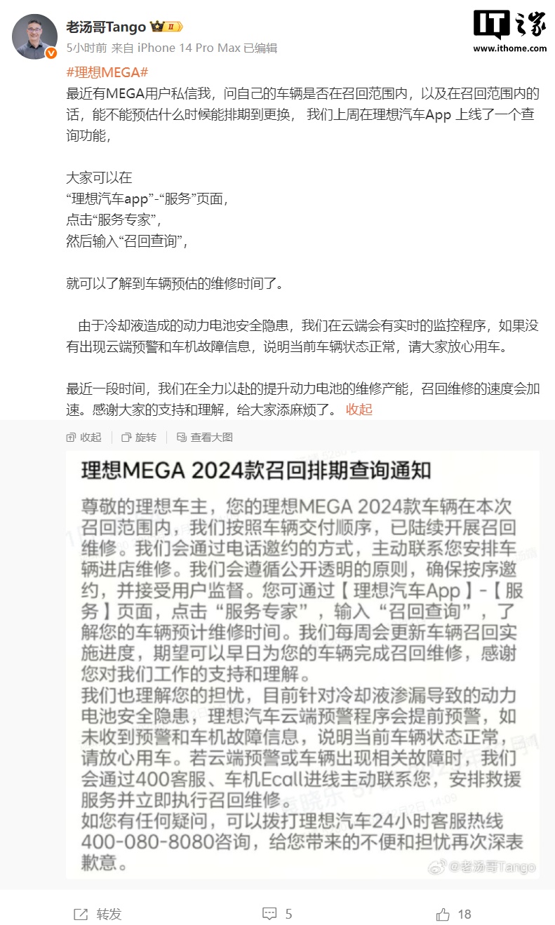 汤靖还称:“最近一段时间,我们在全力以赴的提升动力电池的维修产能,召回维修的速度会加速。感谢大家的支持和理解,给大家添麻烦了。”