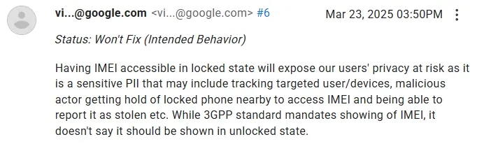 注意到,这一更新与谷歌此前决定相矛盾。今年 2 月,一名用户曾提交建议,希望谷歌允许用户在锁屏界面查看 IMEI,以便执法部门验证设备是否被盗。谷歌当时以“IMEI 属敏感信息,可能被滥用于虚假报失”为由,拒绝了该申请。