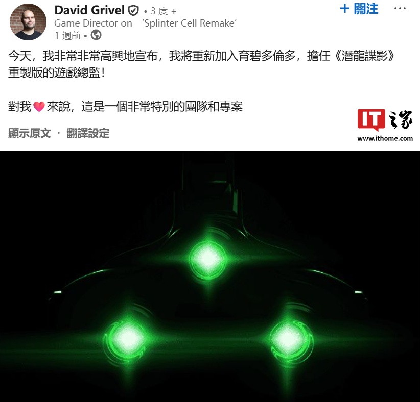 12 月 2 日消息,育碧员工 David Grivel 曾在 2021 年 11 月至 2022 年 10 月期间,担任《细胞分裂》重制版游戏总监,但他在后续离开了育碧,称自己要踏上“一段新的冒险旅程”。