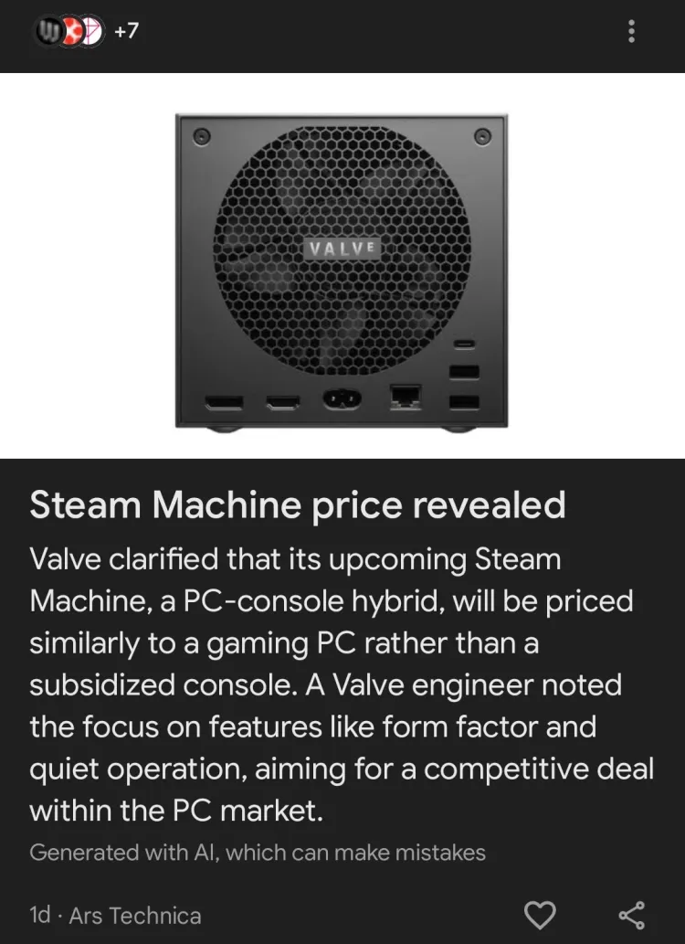 注意到,其中一个例子是“Steam Machine 价格公布”,但实际上根本没公布。Valve 公司明确表示要到明年才会公布价格。Ars Technica 原来的标题要严谨得多:“Valve 的 Steam Machine 外形像游戏主机,但别指望它的定价也如此亲民。”