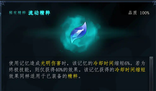 3,光系伤害专属流动精华,感觉搭配新角色小萝莉非常强,就用初始技能灵魂爆弹加一个流动精华,无CD的条件不要太低,光系技能特有的优势,比普通技能更容易无CD。