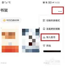 在书架页面,点击右上角的三个点图标(通常位于屏幕的右上角)。在弹出的选项菜单中,选择“导入图书”选项。这一步是为了进入导入图书的界面,尽管我们实际上是要导出小说,但这里通过导入功能可以找到小说的本地存储位置。