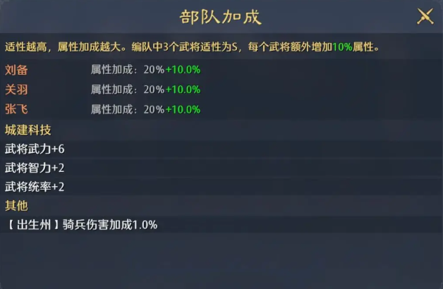 其次在关羽的技能状态当中他的武圣状态是比较独特的,因为这里搭配的是枪兵嘛,所以根据关羽的武神状态带来上面的发动率,有10%提升之后可以在整体兵法中带来更高的价值,在有足够发动力的情况,下面整体阵容的输出就非常稳定,而且后期还有一定的控制效果,加上刘备还能兼顾到这里一个治疗的责任,所以对于前期的搭配来说这里骑兵搭配是能够对重伤类型的目标伤害提升15%的,所以这两者搭配在一起的时候,他们会带来50%的概率,可以给目标附加一些重伤能力,枪兵主动技能吃饭的概率也可以提升10%,所以整体阵容核心思路上面只要多触发,其中的重伤能力以及覆盖更多的虚弱,那么大家一边打的同时触发的更多的武将缘分,一边就可以拉开整体阵容的一个血量差距啦。