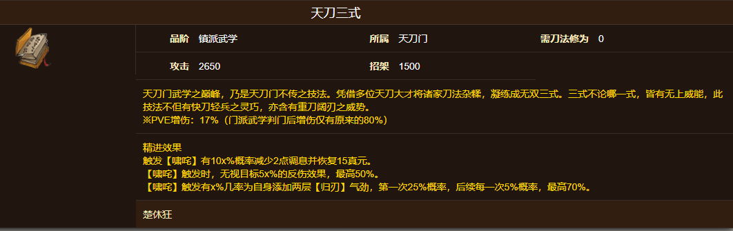 天刀三式:招式受秘技影响变化(如无我重刃、无我快刃),但输出波动大,需精准触发二段伤害,对闪避/招架依赖度高。