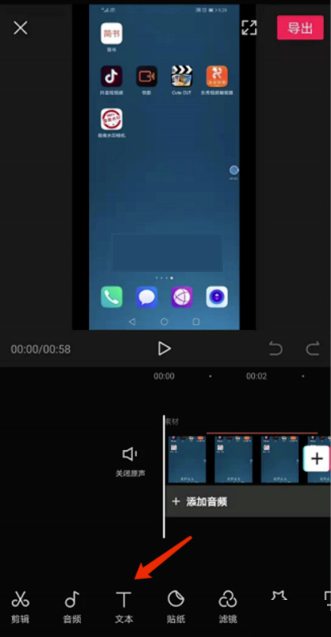 1、打开剪映APP,导入视频文件,点击底部的“文本”;
