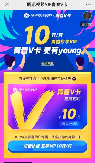 4、完成认证即可开通10元每月的腾讯视频学生会员,可连续开通12个月。