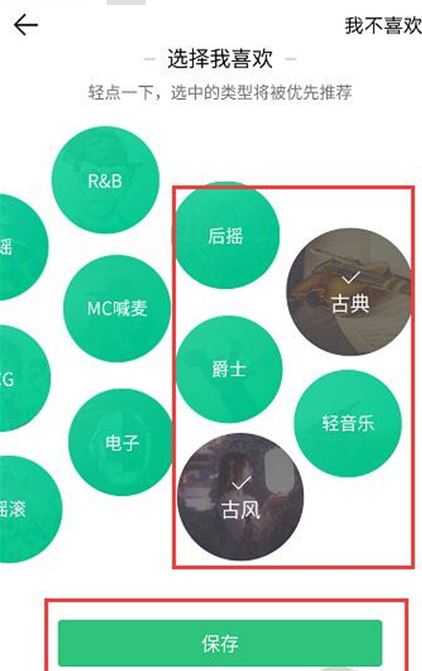 3、然后进行选择自己喜欢的歌曲类型,点击保存就可以了。