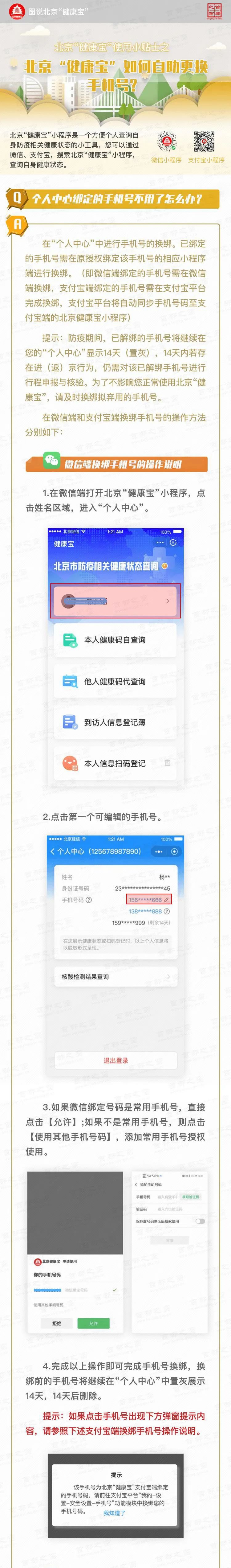 北京“健康宝”最近更新上线了新版本,这个新版的健康宝是支持更换手机号的,对于有需要解绑、换绑手机号码的小伙伴们来说,现在就可以前往支付宝或微信端的“健康宝”小程序中,自助完成手机号码的变更哦!