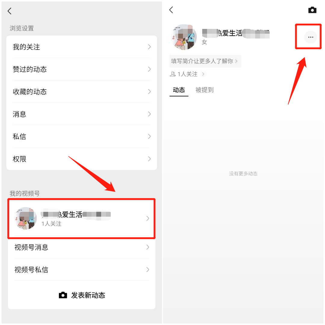 步骤二:进入个人页面,点击【我的视频号】下方的个人昵称,进入个人详情界面。点击右上方【…】,进入个人设置界面。