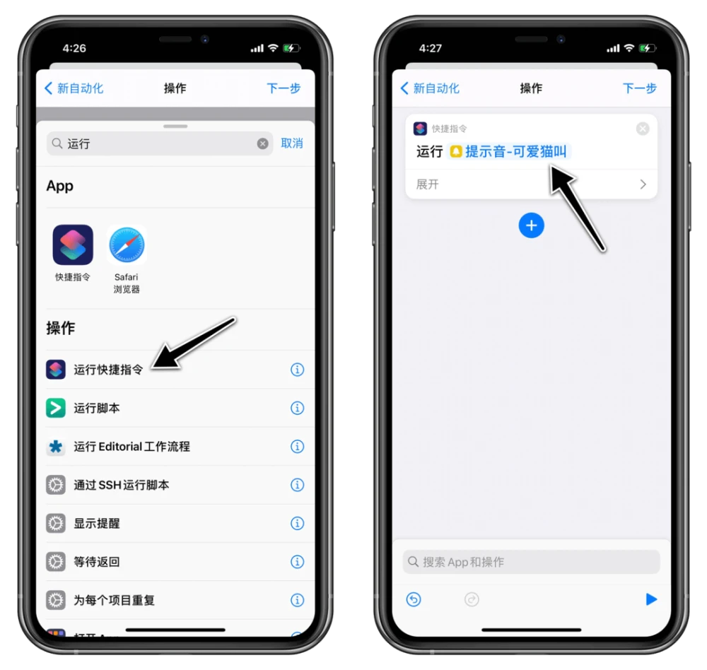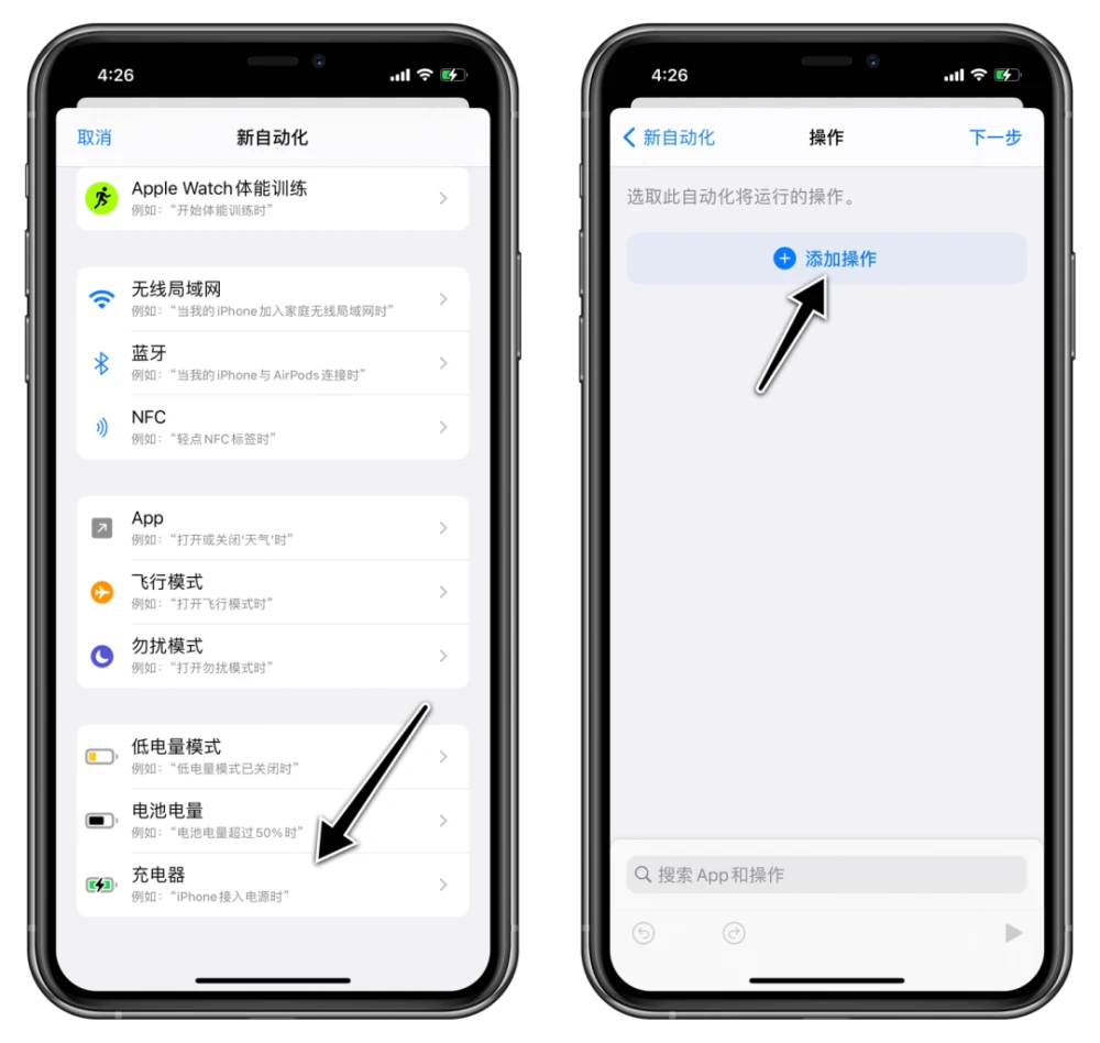 打开快捷指令,点击自动化,右上角加号 - 创建个人自动化 - 充电器 - 下一步 - 添加操作 - App选择快捷指令 - 运行快捷指令 - 选择提示音yaho,关闭运行前询问。