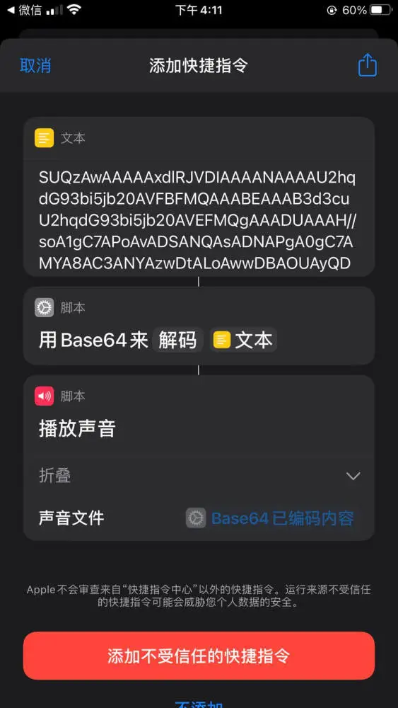 如果你想自己制作其他提示音,需要下载提示音到iCloud drive,接着将编码转换工具添加到快捷指令,接着运行这个指令,选择你要转换到提示音MP3文件。