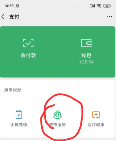 3、然后就能看见在腾讯服务中有一个【城市服务】 的选项。