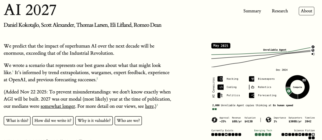 无独有偶,此前另一个项目 AI2027 同样预测,在未来十年内,超人类 AI 的影响将是巨大的,其规模将超越工业革命。