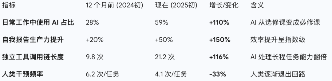 调查显示,在短短 12 个月内,AI 在工作流中的渗透率发生了质变: