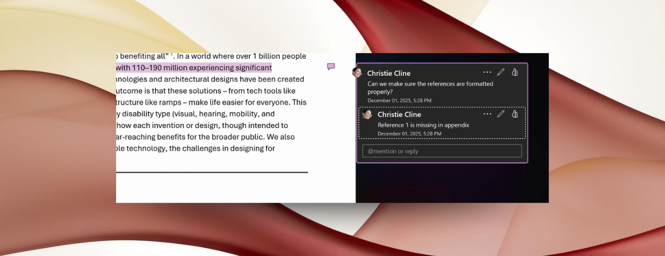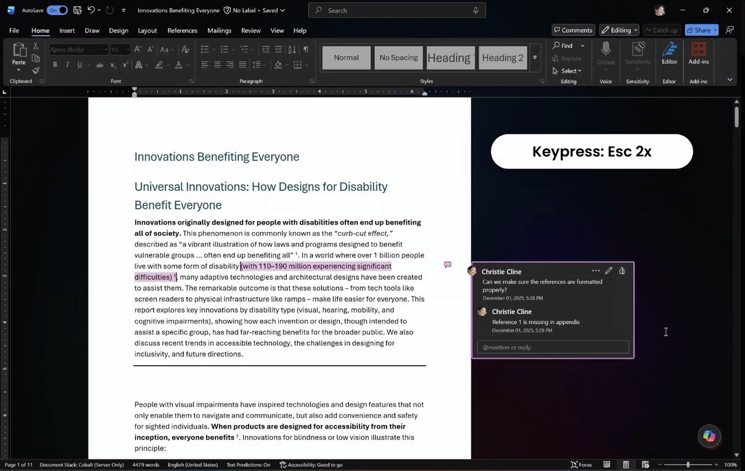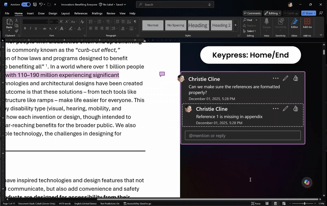 此次升级适用于 Word for Windows 2511 版(内部版本 19422.20000)及以上,在键盘操作与屏幕朗读方面加入多项改进,使阅读和处理批注的体验更高效、也更符合辅助技术用户的使用习惯。