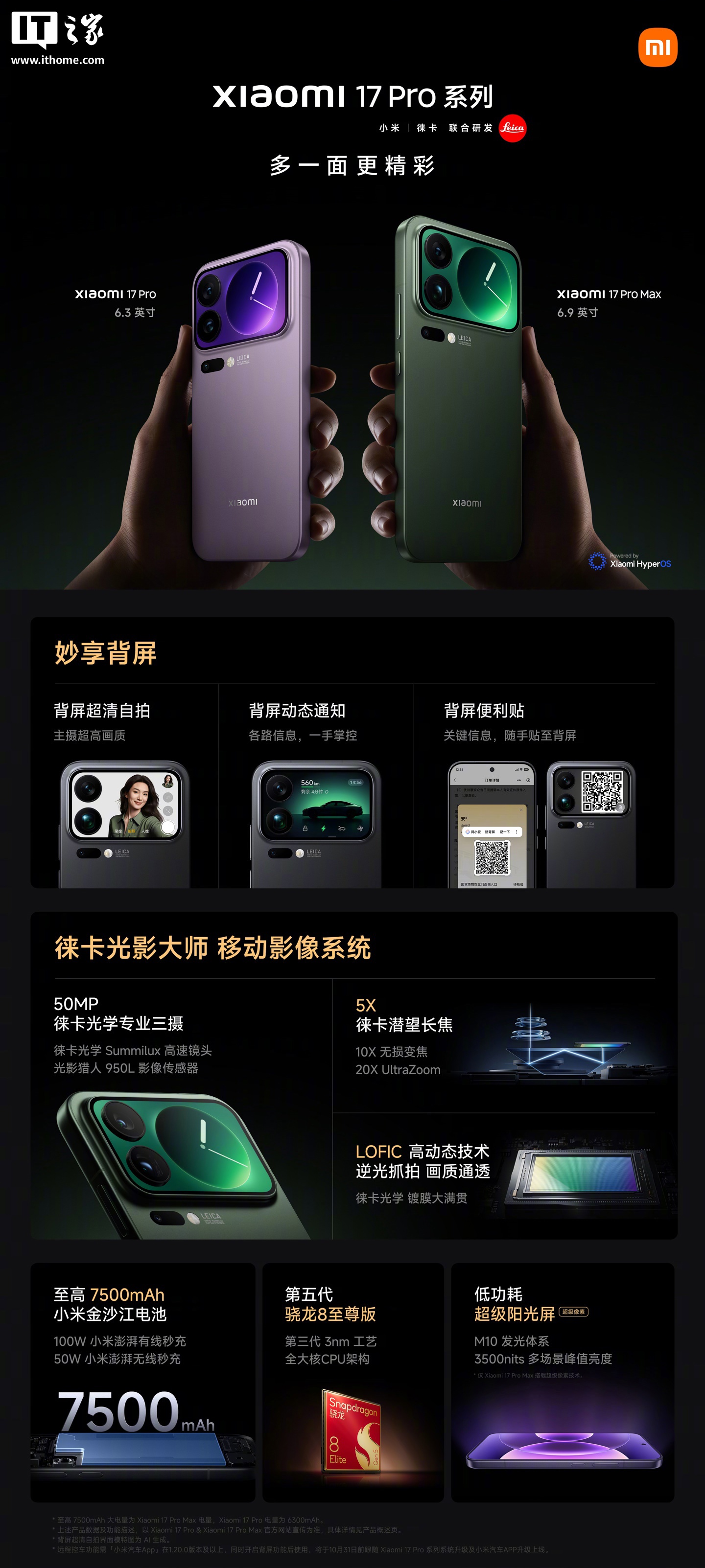 小米 17 Pro Max 采用全新「徕卡光影大师」影像系统,徕卡光学专业三摄,号称移动影像“逆光之王”,主摄搭载全新影像传感器,光影猎人 950L,全新 LOFIC 高动态技术,16.5EV 超高动态范围;搭载 5X 大底潜望长焦,进光量提升 30%。