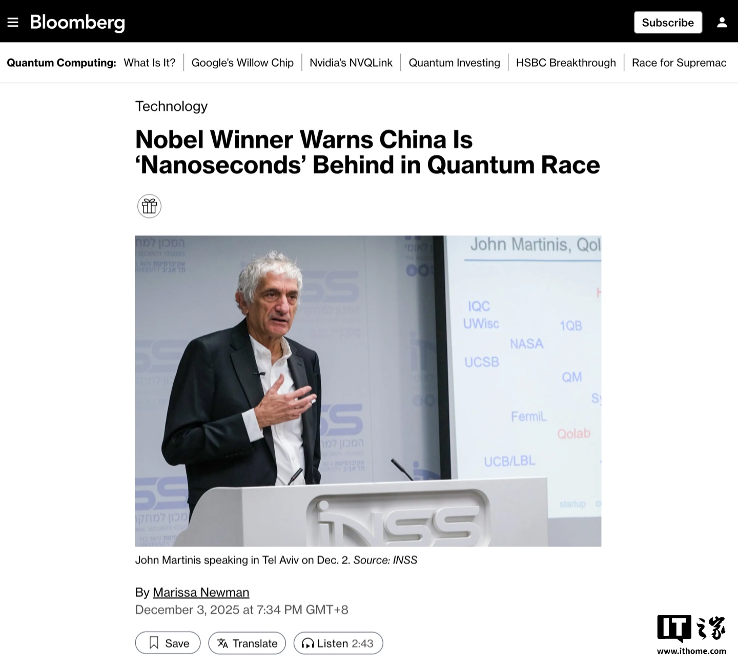 12 月 3 日消息,据彭博社今晚报道,今年的诺贝尔物理学奖得主之一约翰・M・马蒂尼斯(也称马丁尼斯)博士警告,中国在量子计算上的追赶速度极快,与美国之间的技术差距正在迅速缩小。