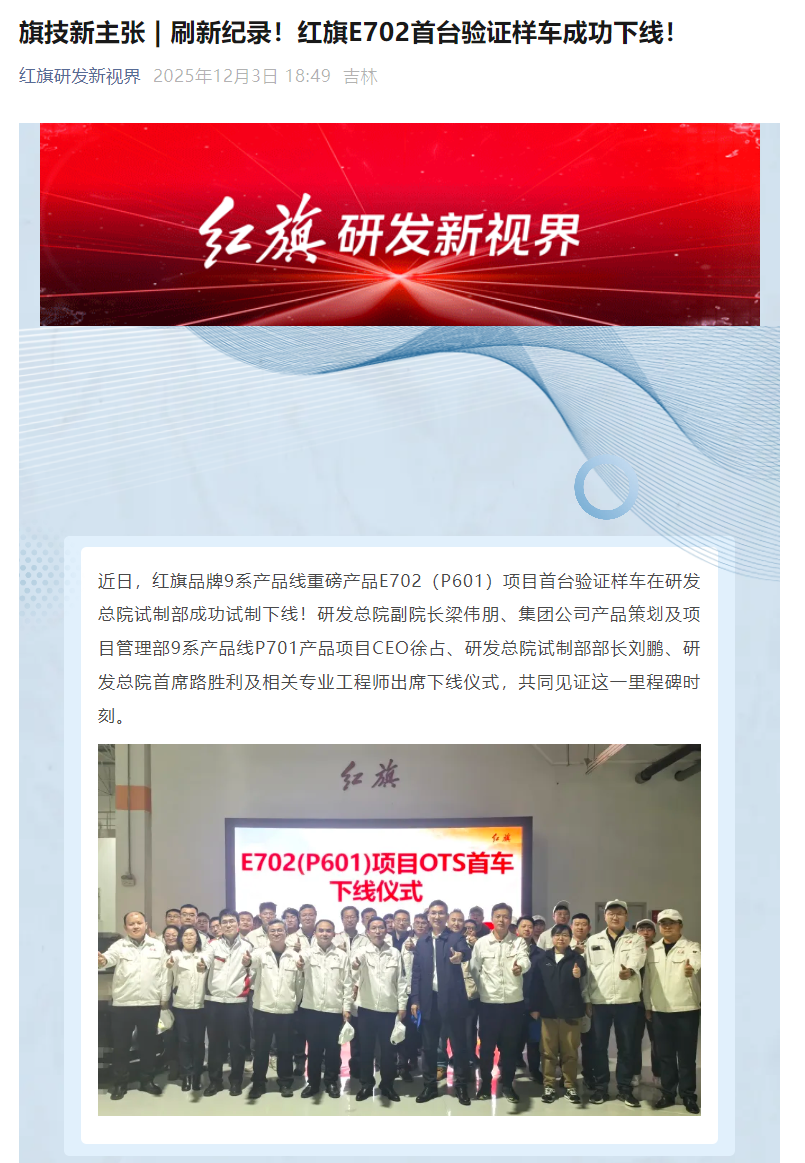 12 月 3 日消息,一汽红旗今日官宣,“红旗品牌 9 系产品线重磅产品”E702(P601)项目首台验证样车在研发总院试制部成功试制下线。