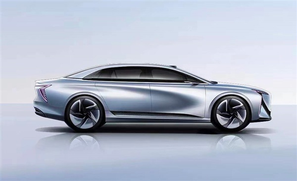 车身侧面,红旗 E702 呈现出修长而流畅的线条,一根从前大灯延伸出来的腰线贯穿整个车身。同时,这款车使用了低风阻的大尺寸轮圈、隐藏式门把手和隐藏式 B 柱,并且预计还会采用无框式门窗。