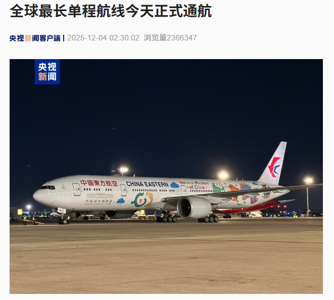 12 月 4 日消息,据央视新闻报道,今天(12 月 4 日)凌晨,中国东航 MU745 航班从上海浦东国际机场起飞,经奥克兰最终将到达阿根廷布宜诺斯艾利斯。