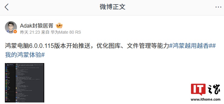 需要注意的是,MateBook Pro / Fold 鸿蒙电脑已开启 HarmonyOS 6 正式版推送,因此华为官方团队分享的更新内容与此前的花粉 Beta 版本相近,但和电脑端推送的版本有所差异,博主 @Adak封狼居胥 分享了电脑端推送版本的更新内容。