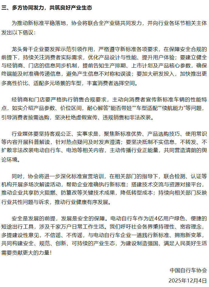 安全是发展的前提,发展是安全的保障。电动自行车作为近 4 亿用户绿色、便捷的短途出行工具,涉及千家万户日常工作生活。我们呼吁社会各界秉持理性、宽容理念,多提建设性意见,不信谣、不传谣,与电动自行车企业一道践行新标准、拥抱新变革,共同构建安全、规范、创新、可持续的产业生态,为建设制造强国、满足人民美好生活需要贡献更大的力量!