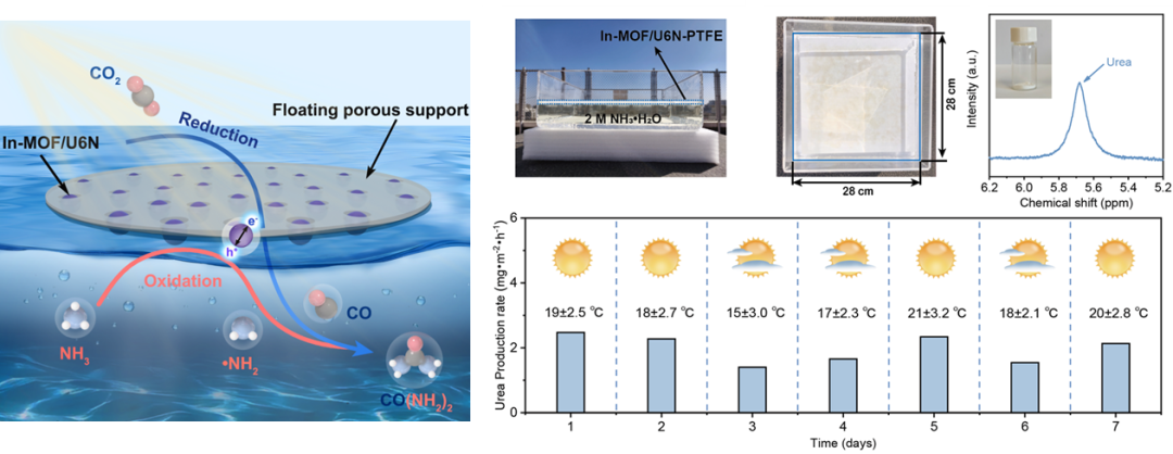 在此基础上,团队结合近期报道的 CO 与氨光催化耦合合成尿素新路径(Angew. Chem. Int. Ed.,2025,64,e202505630),搭建了可在自然环境中运行的漂浮式光催化平台。该平台能够在太阳光照射和开放空气条件下,耦合空气 CO2 还原与水相氨氧化,从而直接将空气 CO2 转化为可水相收集的尿素产物。