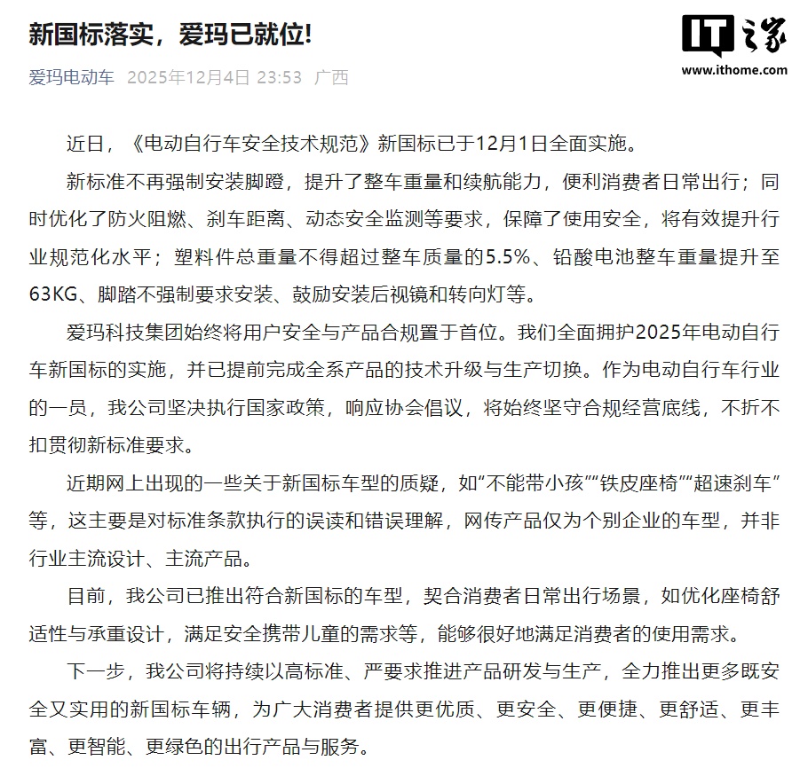12 月 5 日消息,《电动自行车安全技术规范》新国标已于 12 月 1 日全面实施。近期网上出现的一些关于新国标车型的质疑,如“不能带小孩”“铁皮座椅”“超速刹车”等,爱玛电动车今晚发布公告称,这主要是对标准条款执行的误读和错误理解,网传产品仅为个别企业的车型,并非行业主流设计、主流产品。