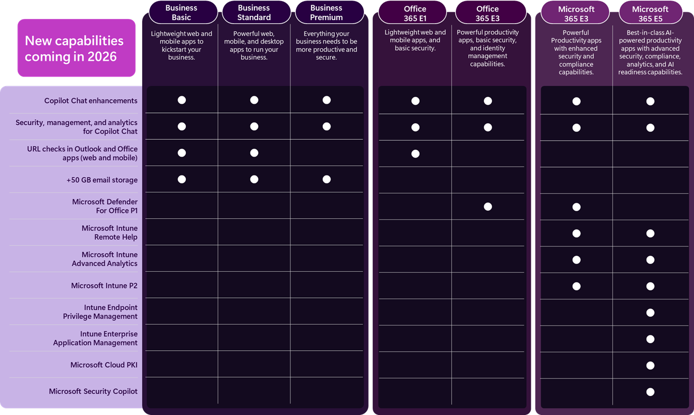 在安全方面,微软将把 Microsoft Defender for Office Plan 1 的部分增强型电子邮件防护功能加入 Office 365 E3 和 Microsoft 365 E3,帮助更多组织识别并阻止网络钓鱼、恶意链接和邮件中的恶意软件。此外,URL 安全检查将扩展至 Office 365 E1、Business Basic 与 Business Standard,以减少用户因点击恶意网站而面临的风险。