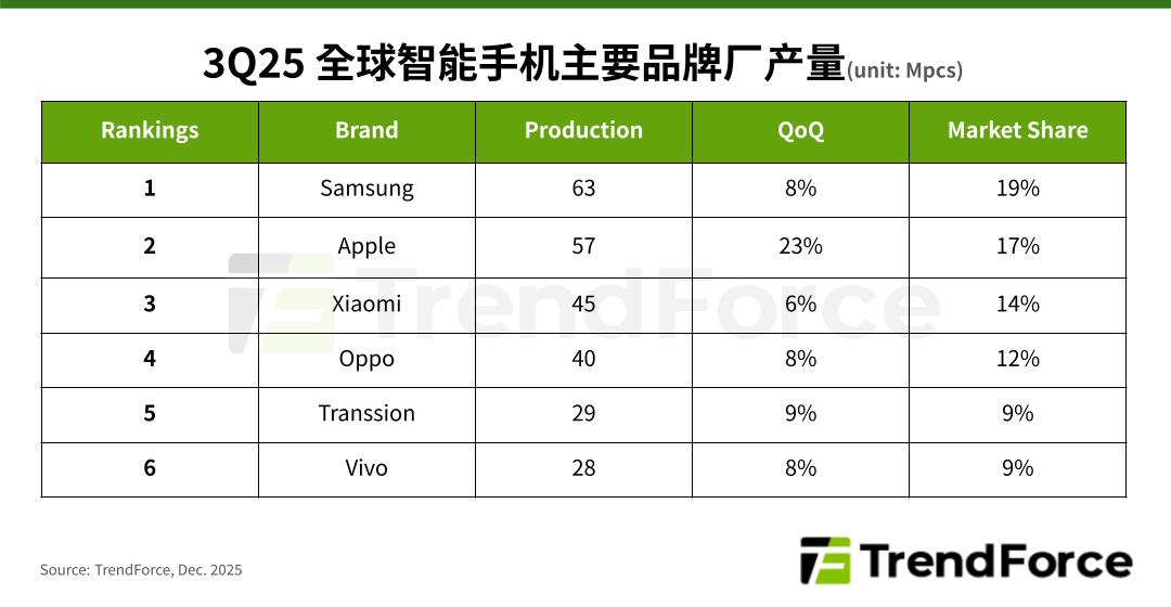 12 月 5 日消息,集邦咨询(TrendForce)昨日(12 月 4 日)发布博文,报告称在传统旺季与新品带动下,2025 年第 3 季度全球智能手机产量为 3.28 亿台,环比增长 9%、同比增长 7%。