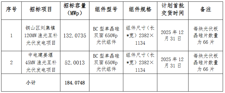 招标公告显示,铜山区刘集镇120MW、姜堰45MW渔光互补光伏发电项目光伏组件招标规模合计184.0748MW,采购BC型单晶硅双面光伏组件。