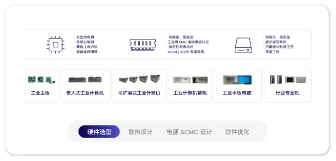 工业场景下内存选型偏向满足多任务并行下的瞬时响应,高频数据交互的情况下需满足宽温与 EMC 电磁兼容,采用 DDR4/DDR5 高速规格,保障性能适配;存储模块则偏向耐久度和数据读写安全,搭配抗震缓冲的封装工艺,例如加工场景下严苛的长时间读写环境,需做到长期运行无掉速、寿命无明显衰减,杜绝数据丢失。