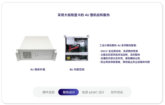 1. 采用大规格显卡的 4U 整机结构散热采用多通道立体散热架构,将 CPU、电源模块等主要发热部件进行分区布局;配置高规格显卡时,可灵活搭配板载高功率风扇,全金属外壳的机箱与高转速的后部风扇,形成 “前进后出” 的定向散热方案,保障 4U 整机内部空间的散热效率稳定。