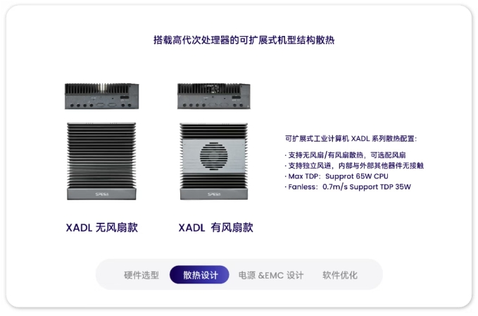 2. 搭载高代次处理器的可扩展式机型结构散热在无风扇需求的特殊场景,研发 “鳍片散热方案”:通过一体化铝合金外壳作为散热载体,当功率参数在 35W 时,鳍片设计可满足散热需求;利用热传导原理,在无机械运转的情况下实现持续散热。若搭载英特尔酷睿 12th / 13th / 14th 的高代次处理器,运行功率可达 65W;若环境影响散热效果,可选择 5 万小时寿命的风扇加强散热,杜绝风扇故障带来的稳定隐患。