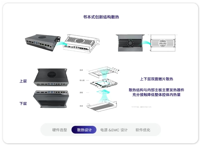 3. 书本式创新结构散热在今年发布的书本式工业计算机中,源控首次采用上下双层双面鳍片散热:散热结构与内部主板主要发热部件充分接触,降低整体腔体内热容量;高性能款使用风扇的独立隔离风道设计,满足高瓦数 CPU 功能需求,同时提高防尘等级,SSD 同步散热,保证整机稳定性;可进一步增强铝件散热能力,使整机热量快速下降。