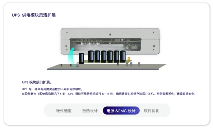 3. 内置 UPS 模块(书本式工业计算机)书本式工业计算机 CIS-HADN-LW01 内置 UPS 模块:异常断电(即使空载)时,可维持系统运行 5~15 秒,确保用户有足够时间保存数据并自动关机,避免数据丢失;出现异常供电情况时,自动切断电源回路,保护核心元器件不受损坏。