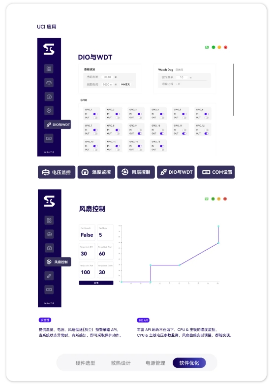 UCI 应用:可降低配置难度、提高部署效率:支持远程监测设备运行状态,实现主机功能客制化配置;支持 IPMI 和 VtT 应用层设置、串口模式(RS232/RS485/RS422)热切换,SmartFan 曲线可在系统下实时调整,满足不同场景需求,提升主板功能易用性。