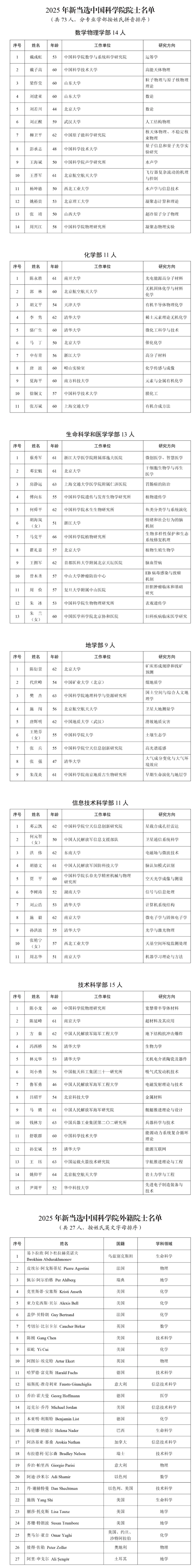 关于公布 2025 年中国科学院院士增选当选院士名单的公告