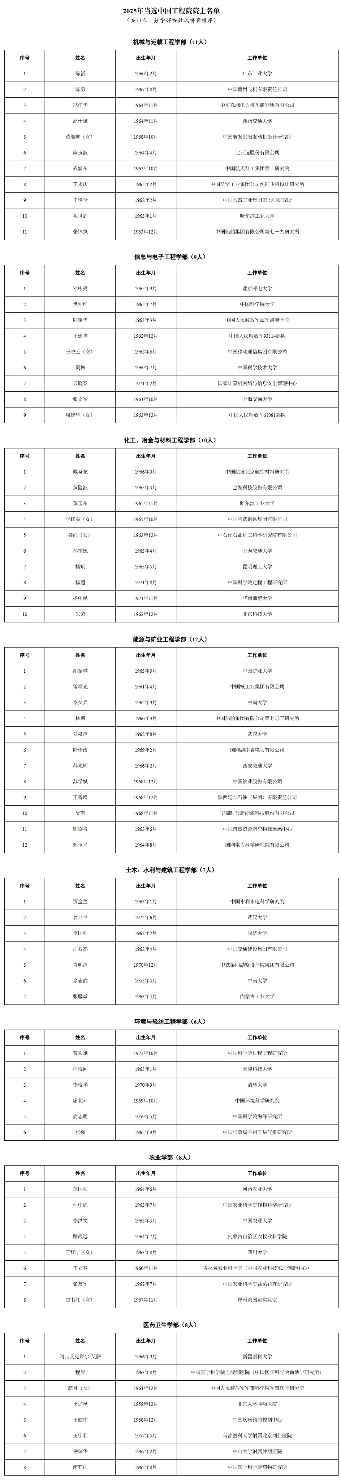 关于公布中国工程院 2025 年院士增选当选院士名单的公告