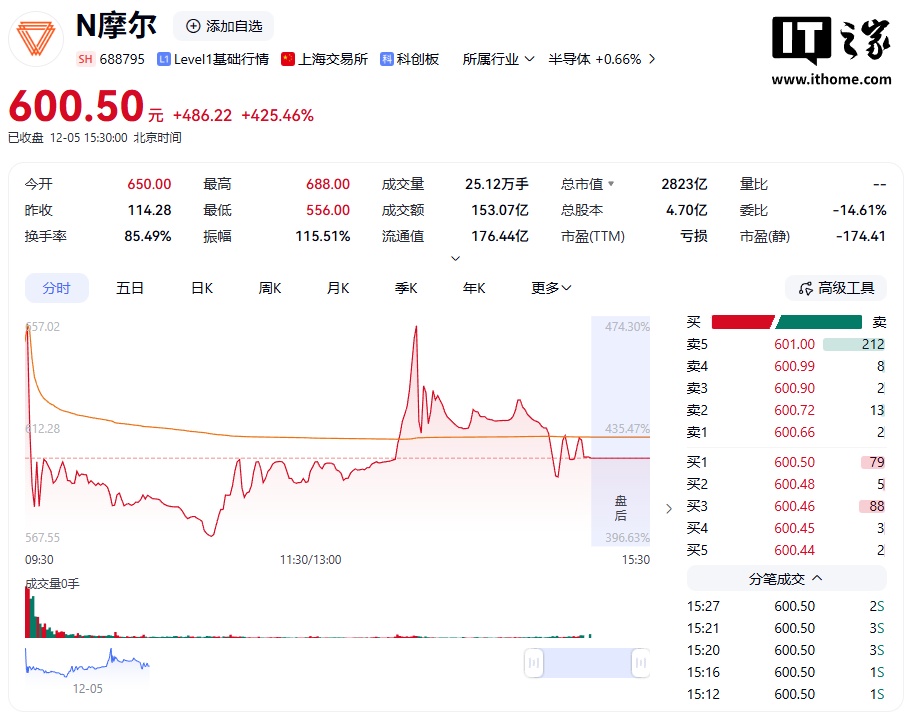 查询获悉,摩尔线程发行价为 114.28 元,今日收盘价涨至 600.50 元,涨幅高达 425.46%,总市值达到 2823 亿元。
