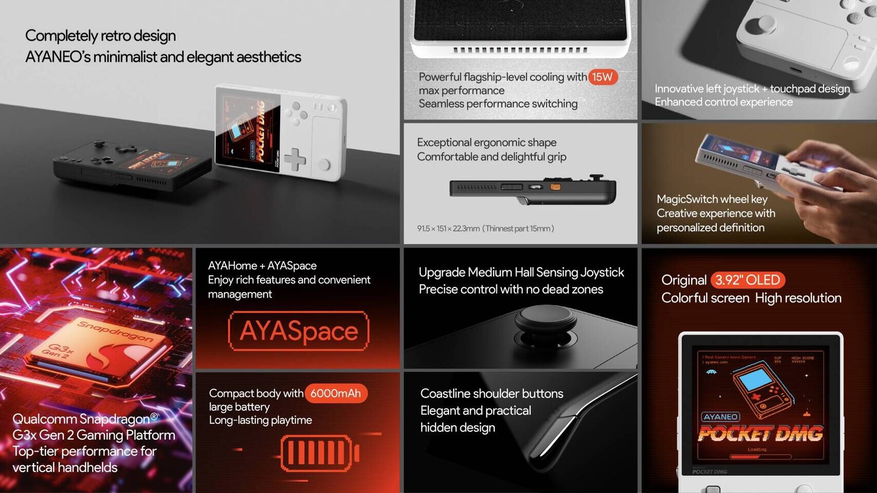 在此援引官方新闻稿,这款掌机搭载 3.92 英寸 OLED 屏幕,分辨率为 1240*1080,像素密度可达 419 PPI,最高亮度 450 尼特,机身宽度 91.5mm,重量 278 克,有一定分量。