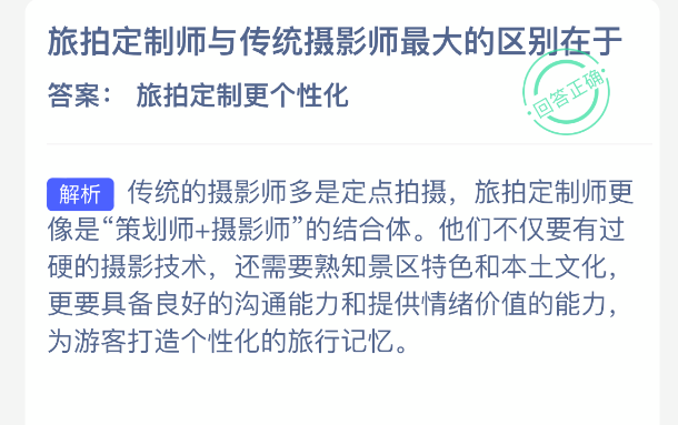 以上就是旅拍定制师与传统摄影师最大的区别在于?支付宝蚂蚁新村最新答案2025年12月5日,更多精彩内容,请点击关注本站手游网更新!